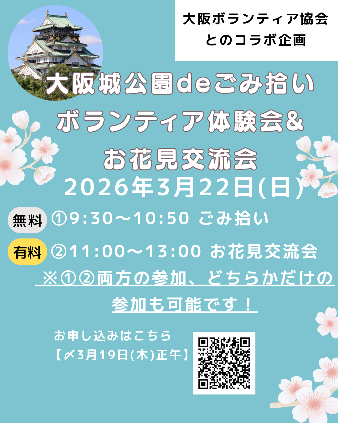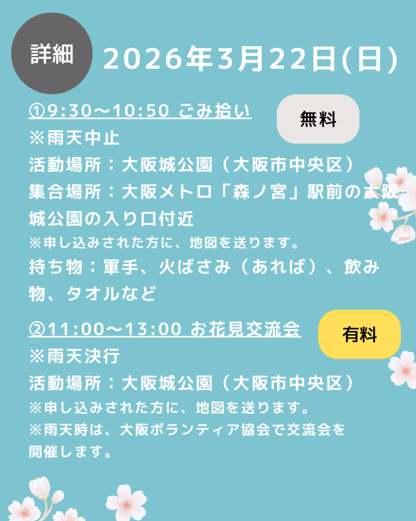 3月22日(土)9:30〜13:00に「大阪城公園deごみ拾いボランティア体験会&お花見交流会」を開催します!