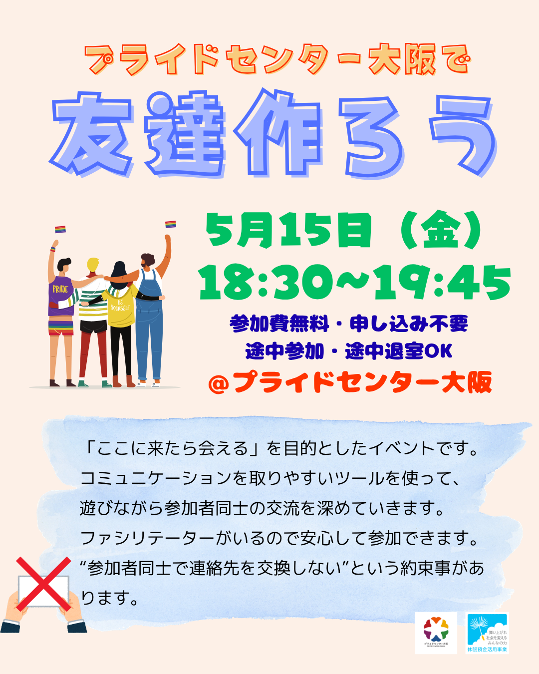 5月15日(金)18:30〜19:45に「プライドセンター大阪で友達作ろう」を開催します!