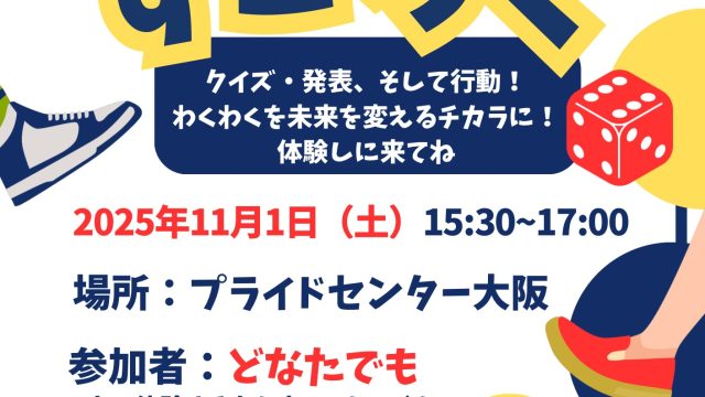 お知らせ 【告知】11/1(土)「SDGsすごろく」を開催 11月1日(土)15:30〜17:00、「SDGsすごろく」をプライドセンター大阪で開催します!小学生と中学生で考えた歩くSDGsすごろく。クイズ、発表、そして行動!わくわくを未来を変えるチカラに!体験きてね。参加費無料・事前予約不要です。... 2025.10.09 お知らせ